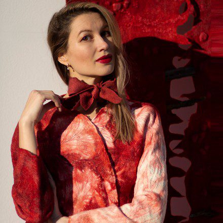 Inspired by the mesmerizing beauty of nature’s shapes and textures, while influenced by the classic arts and antique philosophy, I create unique seamless and reversible wearable art by fusing my art vision with ancient felting technique. Like 3D flexible fiber sculpture, each one-of-a-kind piece is meticulously created, using only hand agitation, soapy water, and hand-selected sustainable loose fibers such as the finest Merino wool, Tussah silk, Flax, as well as raw lamb’s fleece from the small local farms. To implement the art idea I use shibori dye method and brush painting on felted garments.